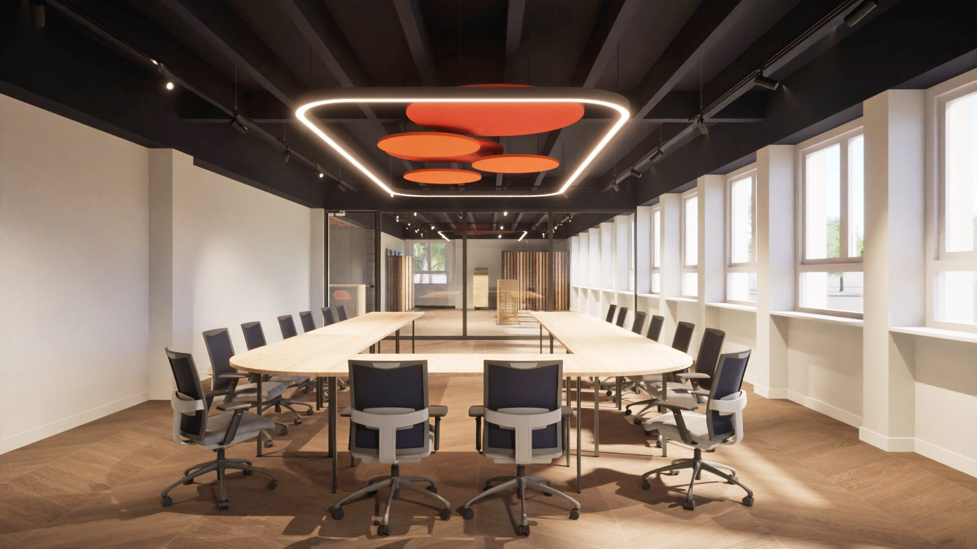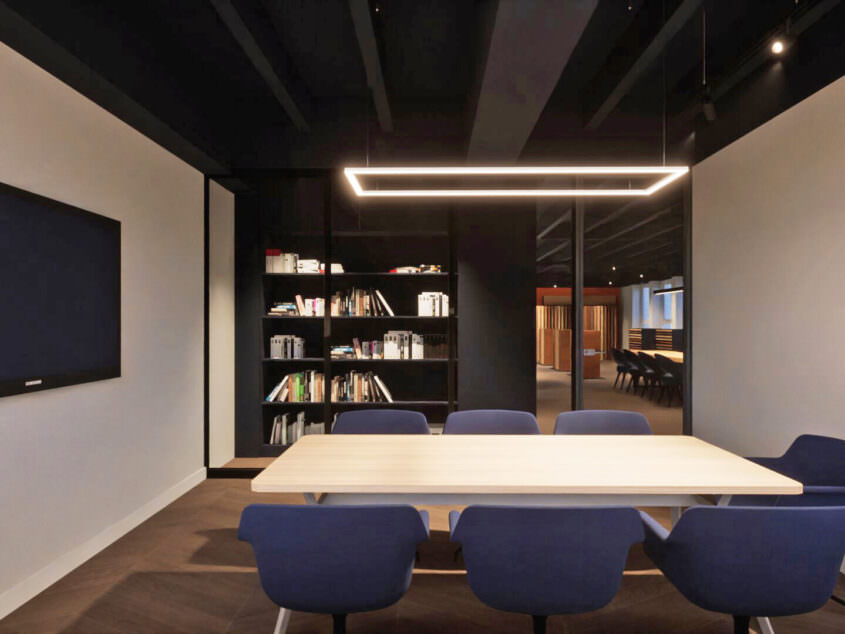 The space blends functional and aesthetic elements to create an inspiring environment that showcases contemporary workplace concepts.