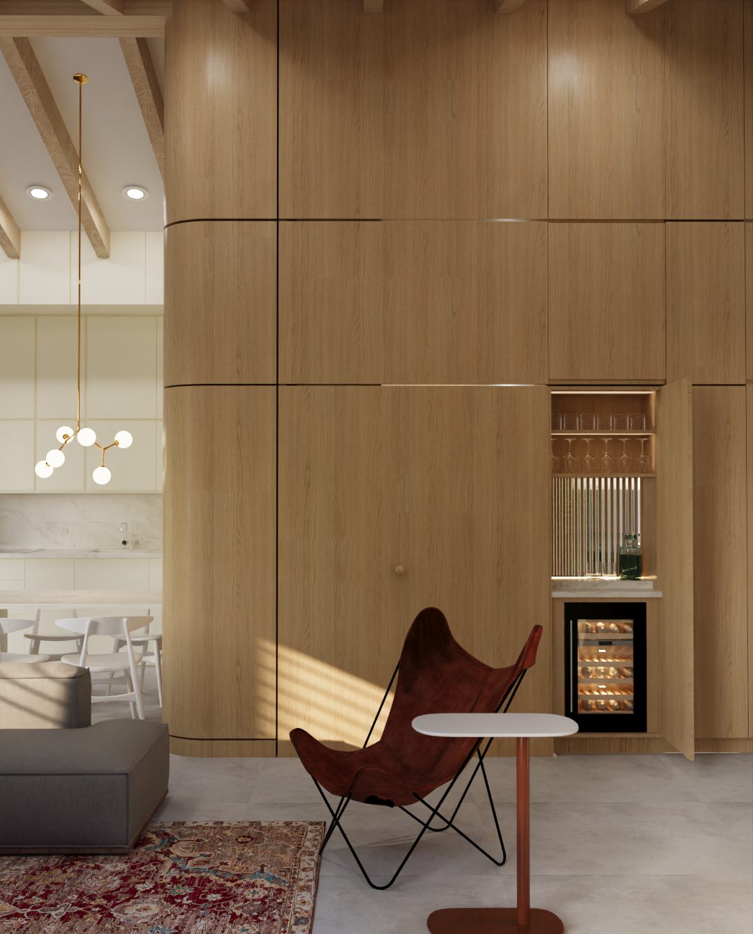 Between the kitchen and living area, a discreet minibar opens, hidden behind floor-to-ceiling wooden panels. Its polished quartzite countertop adds a subtle sheen, emphasizing the luxurious yet understated design.