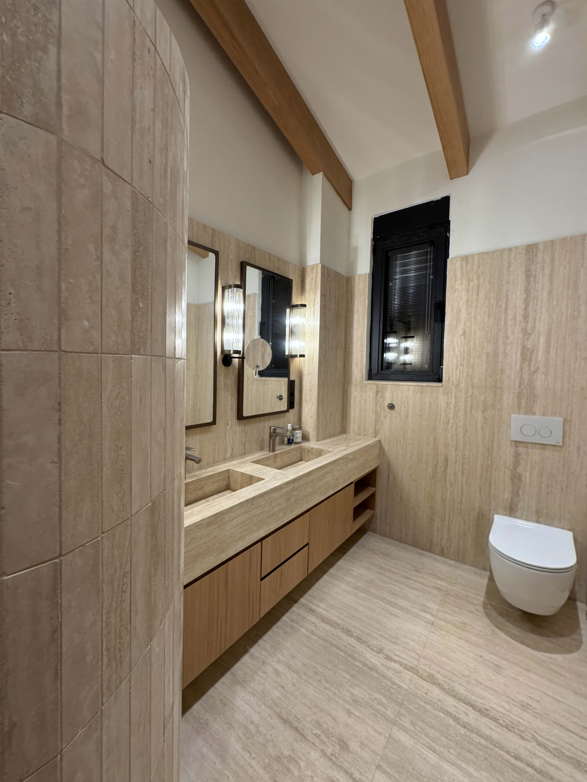 The bathroom, in contrast, showcases travertine at its finest. Stainless steel nickel coloured fixtures add a subtle metallic accent. The interplay of light, stone, and materiality transforms the space into an elevated retreat, uniting calm and luxury.