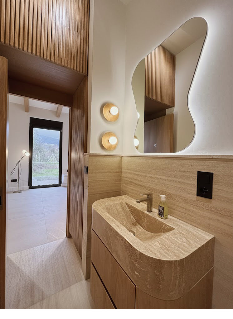 Wooden surfaces and soft, earthy tones give the rooms warmth and a sense of comfort, while white travertine creates an atmosphere of purity and lightness. The open floor plan seamlessly connects the kitchen and living area, fostering both social interaction and relaxed retreat.